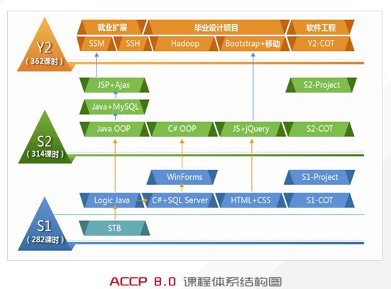 ACCP8.0產品課程體系分三個階段:第一學期(S1)、第二學期(S2)、第二學年(Y2)