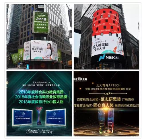 對于企業而言,榮譽是品牌實力最好的見證。細數北大青鳥APTECH的成長之路,收獲榮譽無數,這些獎項榮譽就像一面鏡子,勾勒出的北大青鳥APTECH整體輪廓、發展軌跡和成長風采。2018年初,北大青鳥登上了納斯達克和路透社大屏,在世界的十字路口發出響亮的中國聲音;年末,在騰訊“回響中國”教育年度盛典上,連續11年斬獲行業大獎;在“智IN中國——2018年百度教育盛典”上榮膺“砥志研思-IT教育類”和“匠心育人”。縱觀北大青鳥APTECH發展史,就是一部創造榮譽的奮斗史。