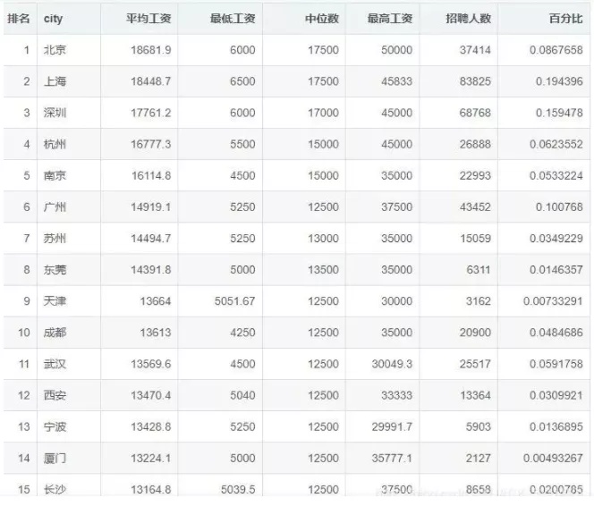 那接下來我們就分析一下“程序員的收入真的高嗎?”。其實在整個互聯網IT行業中,程序員的工資數據是非常透明的,而且每段時間都會有更新,沒有什么保密性可言。下面表中是2021年7月的程序員工資數據,全國程序員平均工資是15302元,不同城市之間會有些差異,但這個差異并不是很懸殊。