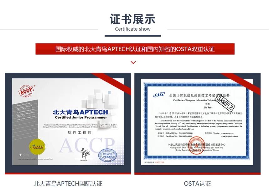 ACCP的培訓目標是職業化的“軟件藍領”。為此,ACCP全面分析了IT業人才市場的需求,設計了科學而系統的課程體系和教學方法,從實用性出發,對學員進行系統而全面的軟件開發技術培訓,在教學進程中時時處處體現能力的培養。因此ACCP是培養實際工作能力的一種認證。我們之所以說ACCP是一種教育產品,是因為它有很多有形的東西:例如明確的教學培養目標和教學大綱,在教學大綱中既有總體目標的描述又有課程的詳細設計,甚至具體到了每一個學時教師所用的膠片,同時又有全套的教學管理規范和學生管理規范,用以保證教學過程和教學質量。所以,通過ACCP的教學過程,確實能體會到:ACCP培訓目標是為了能力的提高,而能力的提高又有一套科學而系統的課程體系和教學方法來保證。